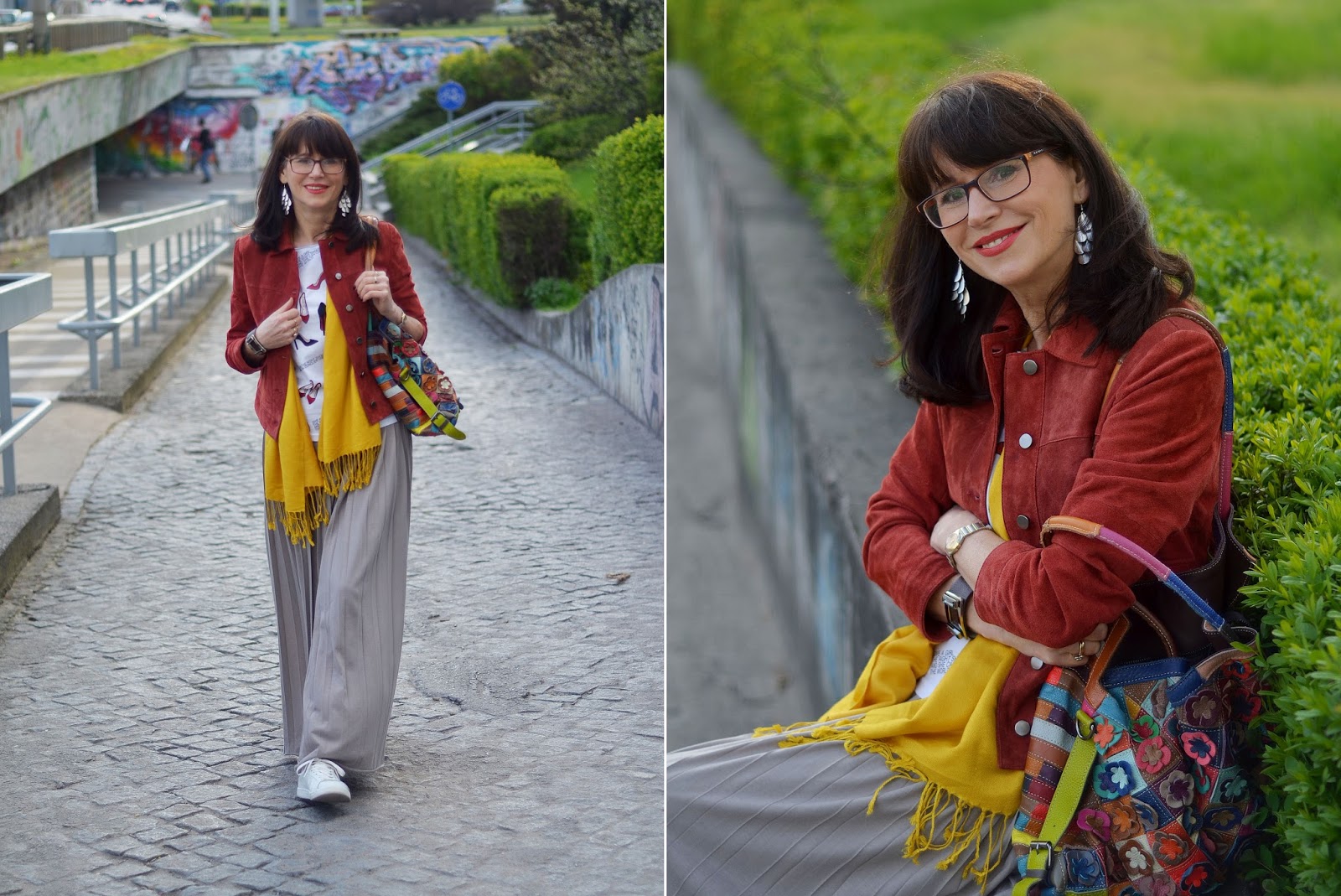 Stylizacja: dzisiaj trochę więcej luzu :) Długa, plisowana spódnica dzięki temu, że jest uszyta z dzianiny, świetnie sprawdzi się z obuwiem sportowym. Do tego t-shirt z bardzo "modowym" printem. Spódnica, t-shirt i białe, skórzane sneakersy, i właściwie to by wystarczyło ale, że pogoda zmienna jest to przyda się coś w rodzaju narzutki. Taką rolę dzisiaj spełnia zamszowa kurteczka w bardzo atrakcyjnym kolorze. Żółty szalik i kolorowa torebka to akcenty, które ożywiają całą stylizację a jednocześnie są wyrazem mojego indywidualnego stylu ;D