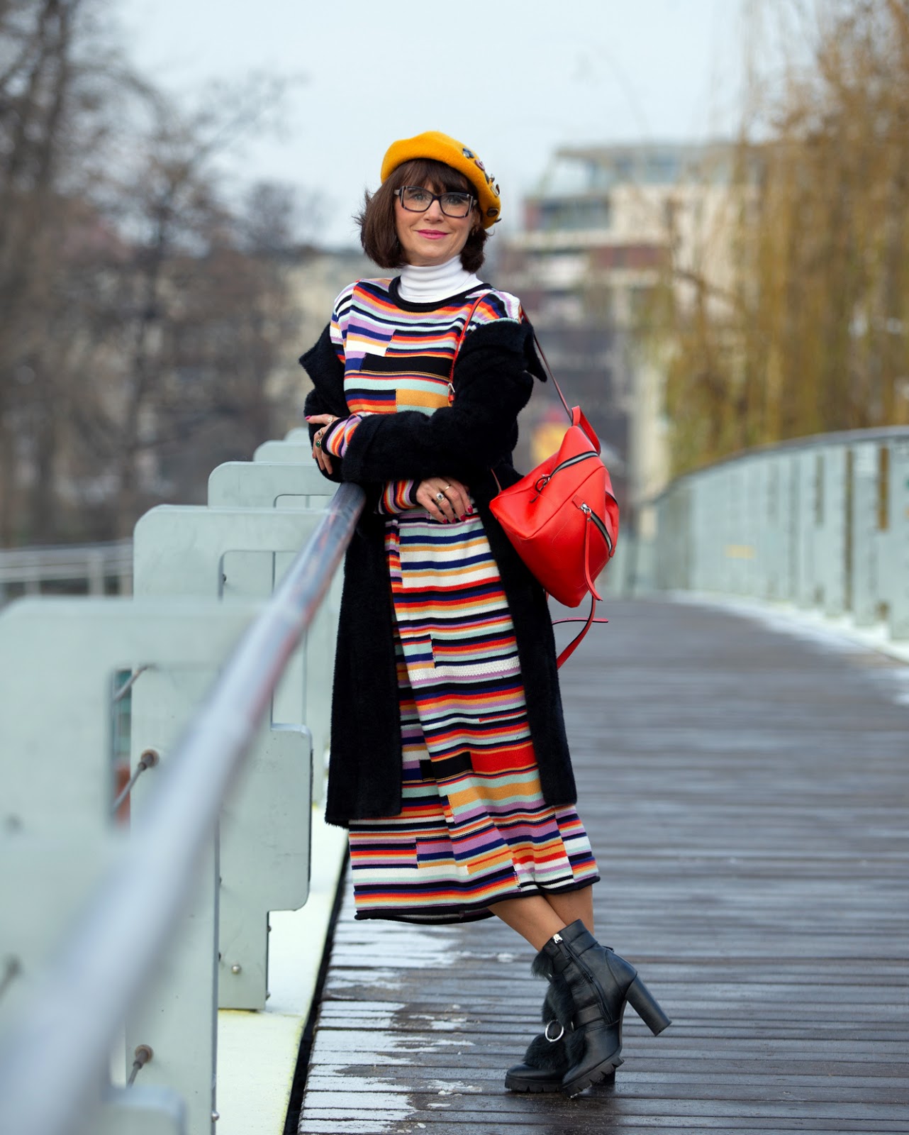 Stylizacja: luźna, dzianinowa sukienka w bardzo żywych kolorach. Bardzo ją lubię, jest wygodna baaardzo kolorowa, co sprawia, że jak ją ubieram to od razu humor mi się poprawia. Jest takim "rozweselaczem" i doładowaniem baterii w taką nijaką pogodę :) Pod nią założyłam biały golf, który bardzo fajnie komponuje się z sukienką a dodatkowo ją "dociepla", gdyż przy takiej wilgotności powietrza, zimno jest bardziej dokuczliwe. Oczywiście bez wierzchniego okrycia nie da rady już się "przechadzać" po dworze toteż płaszczyk musi być. Dzisiaj włożyłam czarny, wełniany, mój nowy nabytek, a na nogi - czarne, fantazyjne botki z futerkiem. Głowę zaś "przystroiłam" beretem, który udekorowałam guzikami, taka moja twórcza inwencja ;D